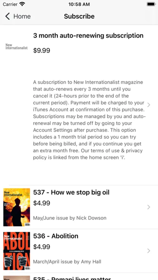 Purchase single copies of New Internationalist magazine via in-app purchase or buy a 3 month or 12 month subscription for access to the entire digital archive of magazines.