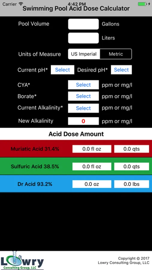 Pool Acid Dose Calculator will calculate the exact amount of acid necessary to lower pH and alkalinity in any size swimming pool or spa. No more guessing at the amount of acid or adding acid and retesting the water later to determine the changes to pH and alkalinity. Find out how much acid is needed to lower pH and it will give you the alkalinity after the dose. Use it to find out how much acid is needed to lower alkalinity and know the resulting pH after addition. Find out what an amount of acid will do to pH and alkalinity.