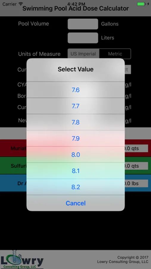 Forget Acid Demand water tests and look up tables to determine the acid amount to lower pH. They don't give you the alkalinity after the dose and they are difficult and time consuming. Pool Acid Dose Calculator save you time and money because it gives you the exact amount of acid so you are not under-dosing or over-dosing acid and not having to make corrections. Best of all, you can use it at the pool or spa to get the right amount of acid on-site.