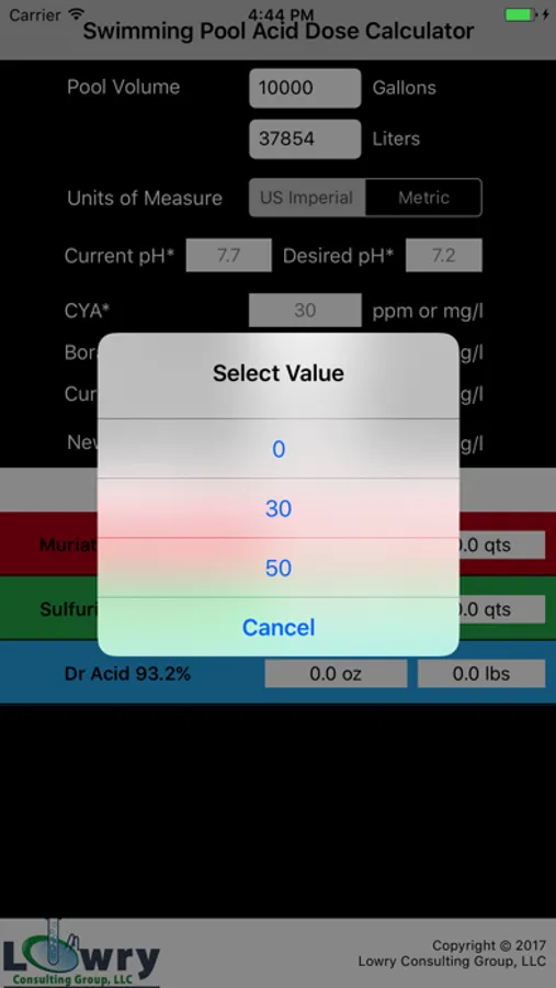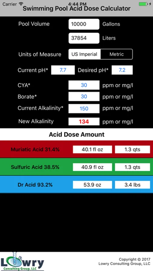 Pool Acid Dose Calculator gives acid dose amounts for muriatic (hydrochloric acid), sulfuric acid and dry acid in fl oz, qts, oz and lbs. Also, change from US measurement to metric and get results in ml, L, g and kg.
