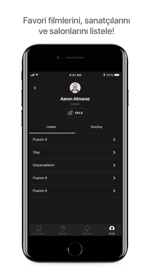 • Sinemalar.com profilinizle uygulamaya giriş yapabilir, ilginizi çeken filmler ile sanatçıları favorilerinize ekleyebilir ya da kişisel listeler oluşturarak düzenlemeler yapabilirsiniz.