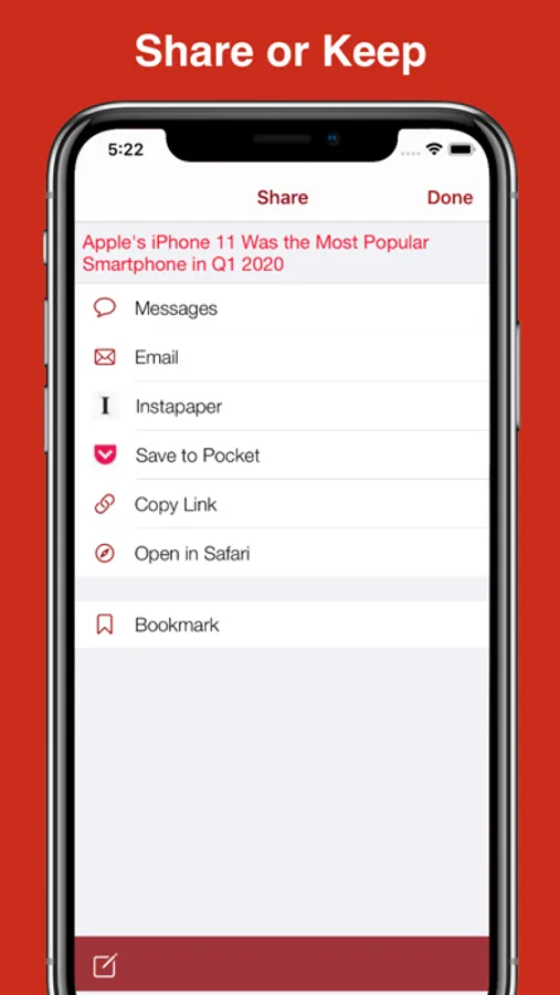 * Share to Pocket, Instapaper, Email, Browser and Message.