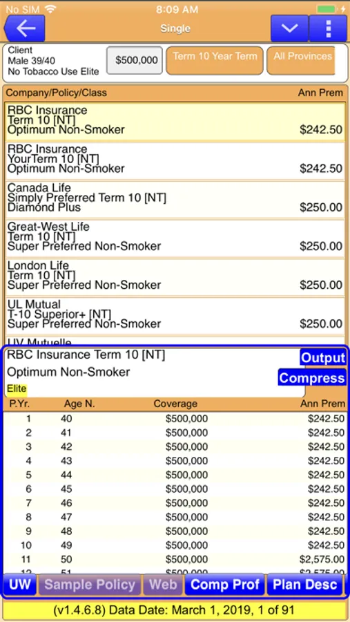 Since life insurance and related products differ significantly in many regards, InteliComp provides additional detail and information that is necessary in the course of research for suitable solutions and the selection of products to serve the best interests of clients. Therefore, in addition to premium cost quotations and comparisons in the various payment frequencies and modes, InteliComp™ also provides detailed year-by-year cash values, paid up values, term renewal costs, waiver costs, initial underwriting evidence requirements, descriptions, etc and as applicable.