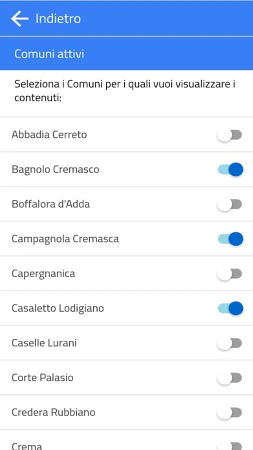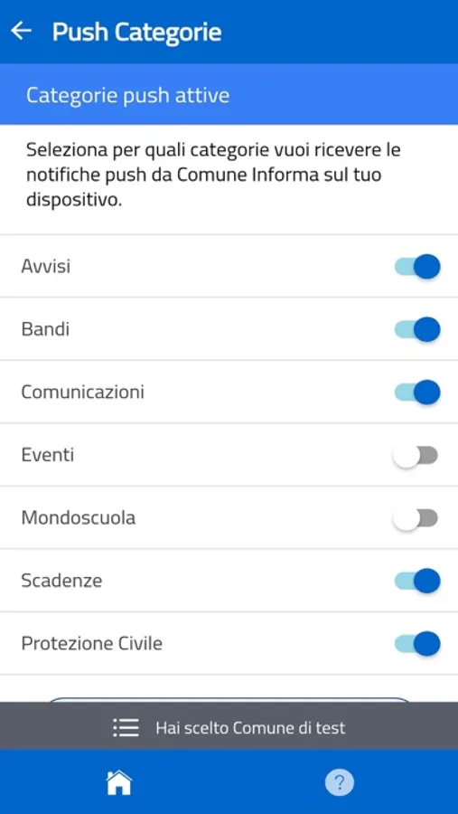 L’Utente può scegliere il Comune da cui vuole ricevere le informazioni, il tipo di notizie di interesse e personalizzare il tipo di notifica in modo da ricevere solo le informazioni a cui è interessato.