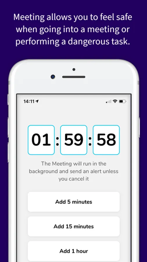 The Meeting Timer allows you to set up an expected meeting duration time. Once this is done, a countdown timer starts both on your phone, and remotely in our secure servers. This timer must be stopped within that period of time in order to prevent the alarm being activated in the RE:SURE Control Centre. If the alarm time needs to be extended a discrete push of a button can postpone it in 15-minute/1 hour intervals.