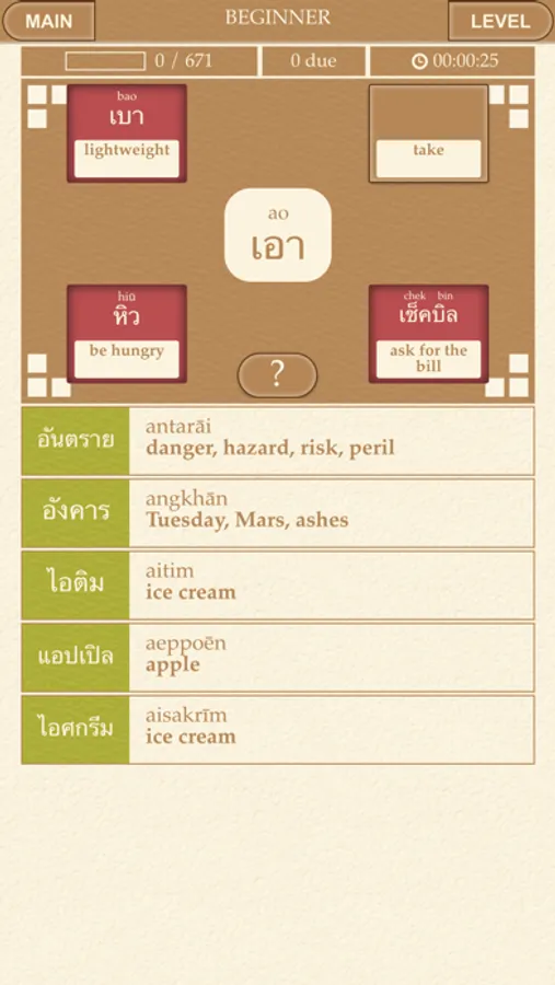 - 6 Thai games: Thai flashcards, Thai multiple choice, Thai tiles, listening flashcards, listening multiple choice, matchup.