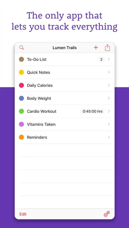 Lumen Trails lets you take notes, make lists and keep track of other things in your life such as time, workouts, expenses, calories, food, weight, sleep or anything else you can think of, even where you've parked your car. Thousands of people use it every day, and they love it because it truly makes a difference in their lives.