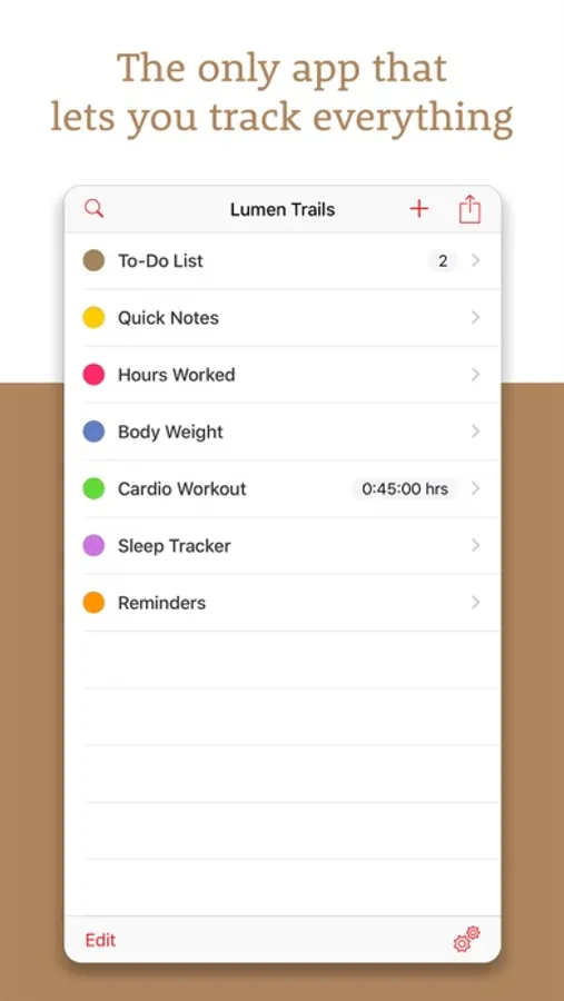 Lumen Trails lets you take notes, make lists and keep track of other things in your life such as time, workouts, expenses, calories, food, weight, sleep or anything else you can think of, even where you've parked your car. Thousands of people use it every day, and they love it because it truly makes a difference in their lives.