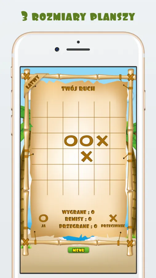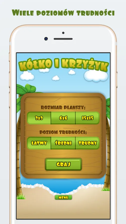 Wybierz swój ulubiony rozmiar planszy i poziom trudności. Możesz wybrać jedną z trzech dostępnych planszy - klasyczną 3x3, trudniejszą 6x6 i największe wyzwanie 15x15 - oraz łatwy, średni lub trudny poziom trudności.
