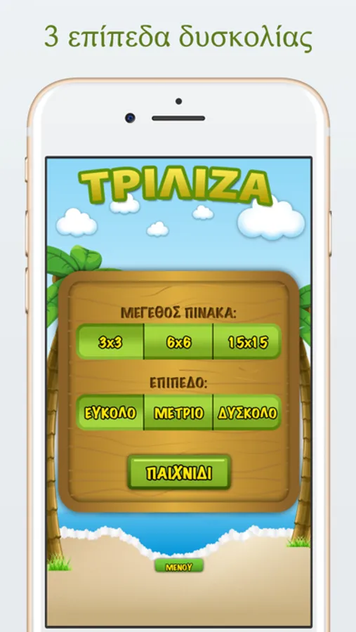 Μπορείς να επιλέξεις έναν από τους τρεις διαθέσιμους πίνακες - κλασσικό 3x3, πιο δύσκολο 6x6 και τη μεγαλύτερη πρόκληση 15x15.