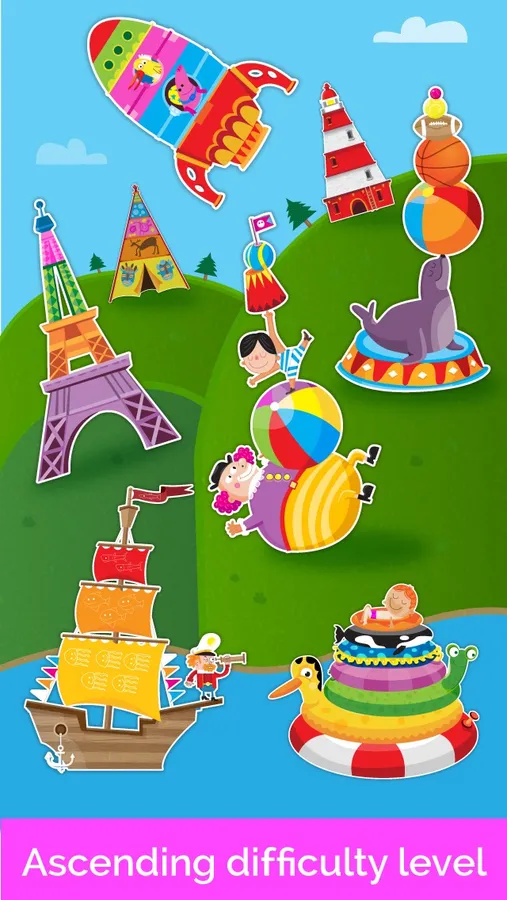 A set of stacking games. The game is designed to help children acquire basic concepts such as: big VS. small, before VS. after, and bottom VS. top. Game boards are organized in an ascending difficulty level.