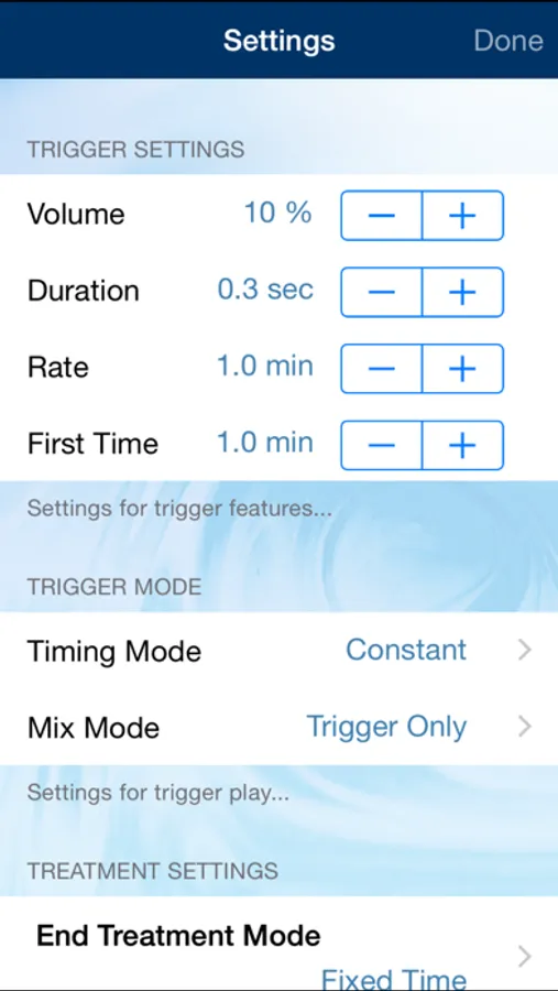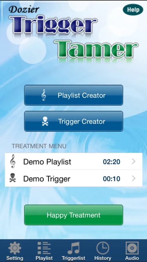 Caution: Do not use the Trigger Tamer if it is unpleasant. Don't "be tough" and use a strong trigger. This app is for wimps. Take it easy, start with a very low volume, short trigger that creates an "eye blink" size reaction. Allow your response to change slowly. When the response decreases, you can then increase the length and volume of the trigger, always keeping your response very small and brief.