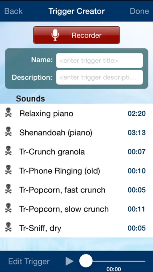 Load your favorite music from iTunes. You can load a trigger using iTunes or record and edit a trigger with the app. Your job is to relax (or dance) to the music, and allow your misophonic response to fade away.