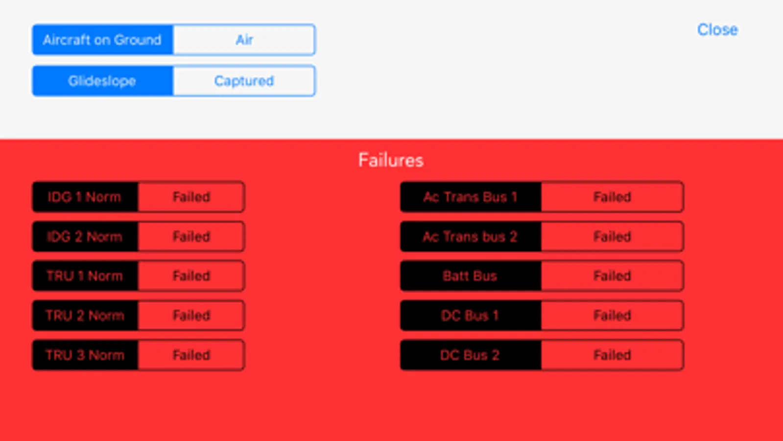 The user can simulate a failure which allows the user to use a QRH to work through each failure.