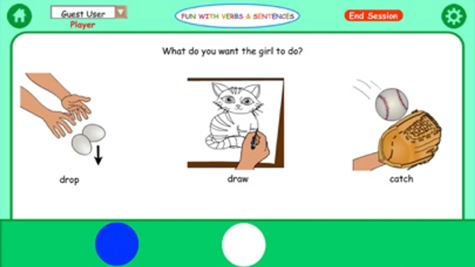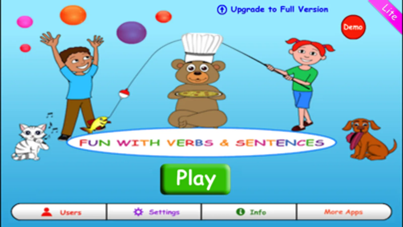 This app is for the iPhone, and designed for a single user. It provides three verbs for each sentence type selected including: catch, eat, fall, go, hide, jump, play, push, sing, and sneeze.