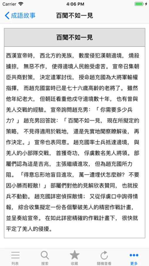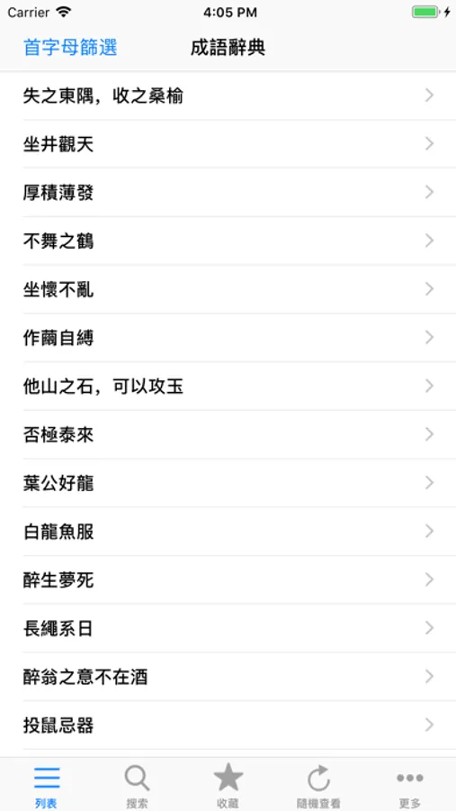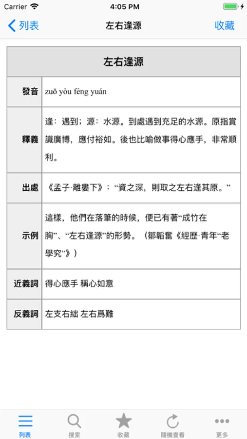 适合最新iOS系统的成语辞典,收录了近四万条成语以及近千条经典成语故事, 同时提供了分类浏览模式, 比如可以按描写季节、心情、天气、人物,出自名人、名著等方式来查看成语。