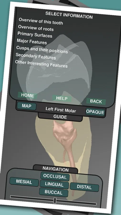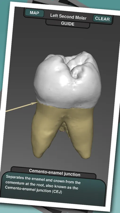 The app also contains a guide to the morphology and features of the teeth, with 3D demonstrations of how they relate to the tooth in question. A major advantage of using real teeth is that many show interesting and unusual features, which would be seen on dental patients. These can be explored and are explained through an interactive guide.