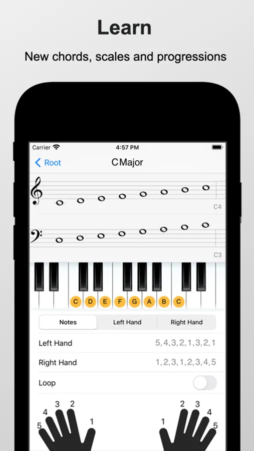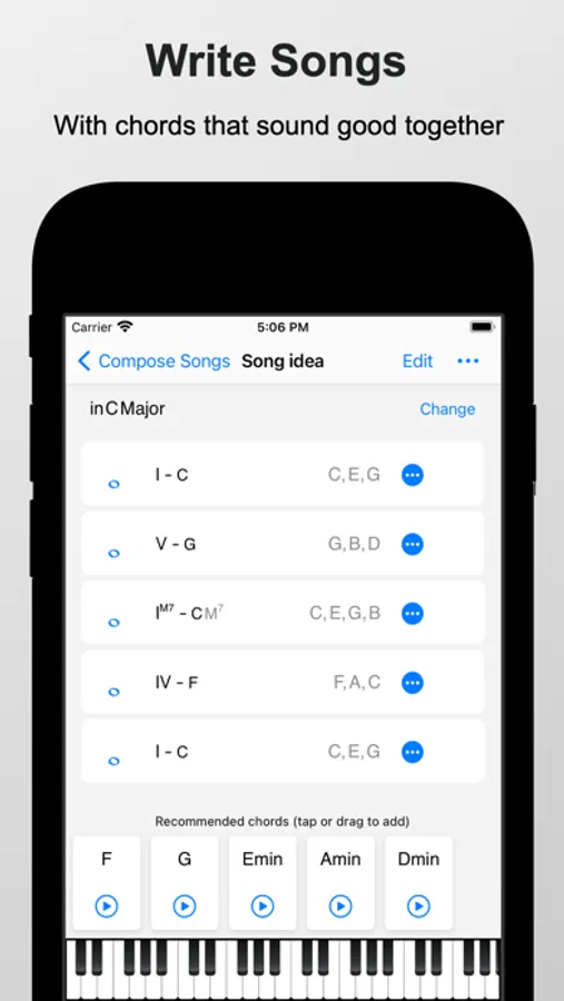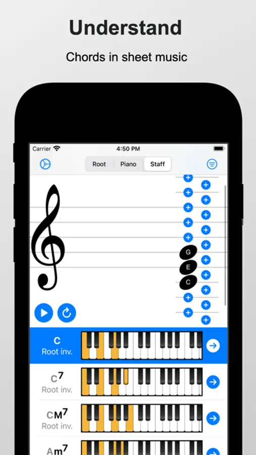 All chords and scales can be played ascending, descending, and harmonically and are shown on virtual piano and staff. The root note and inversion of the chords can easily be changed. App also includes a song composer that allows you to easily layout chord progressions and recommends chords based on selected scales.
