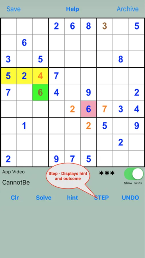 The "hint" button toggles between a text only hint and one that also displays a clue on the puzzle. The STEP button displays all hint details and alters the puzzle accordingly.