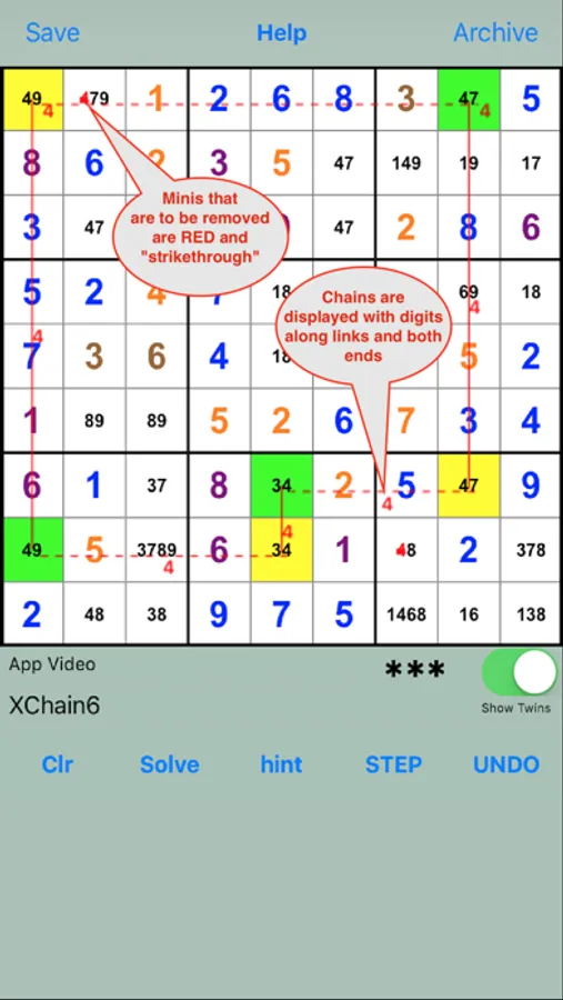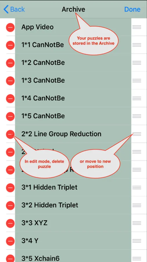 Puzzles are entered manually in a Sudoku grid or by entering (or pasting) an 81 character string. Puzzles can be saved, recalled, changed, deleted, and reordered in the Archive.