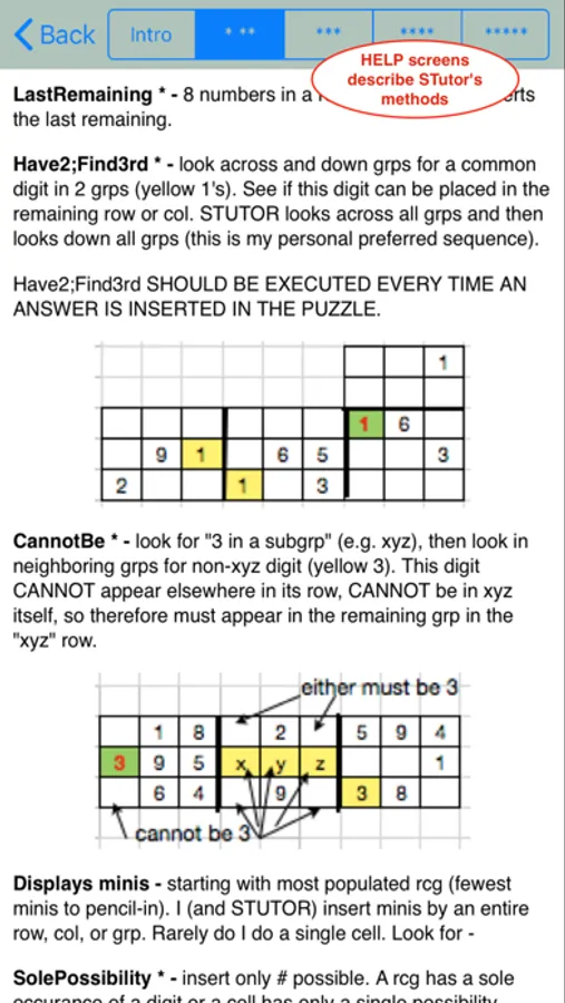 STUTOR solves puzzles using 5 strategies following a logical sequence of methods. The sequence and methods are described in five (5) HELP screens.