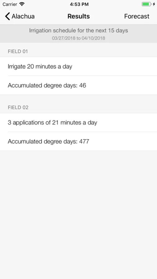 Producers can register fields in the app and receive notifications regarding irrigation schedule changes due to differences in the expected evapotranspiration for the next few days.