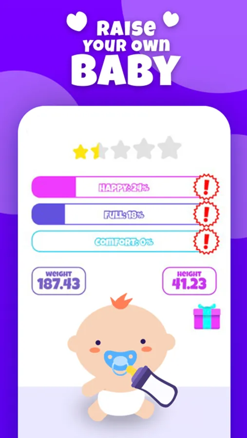 Play, feed, and burp this digital baby pet daily to keep them happy. How big will your baby get? Take care of your baby to increase its weight and height, and earn Star Levels in the process.