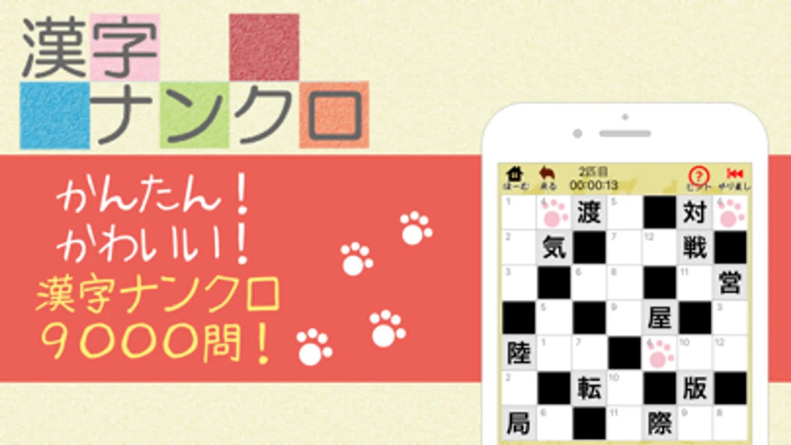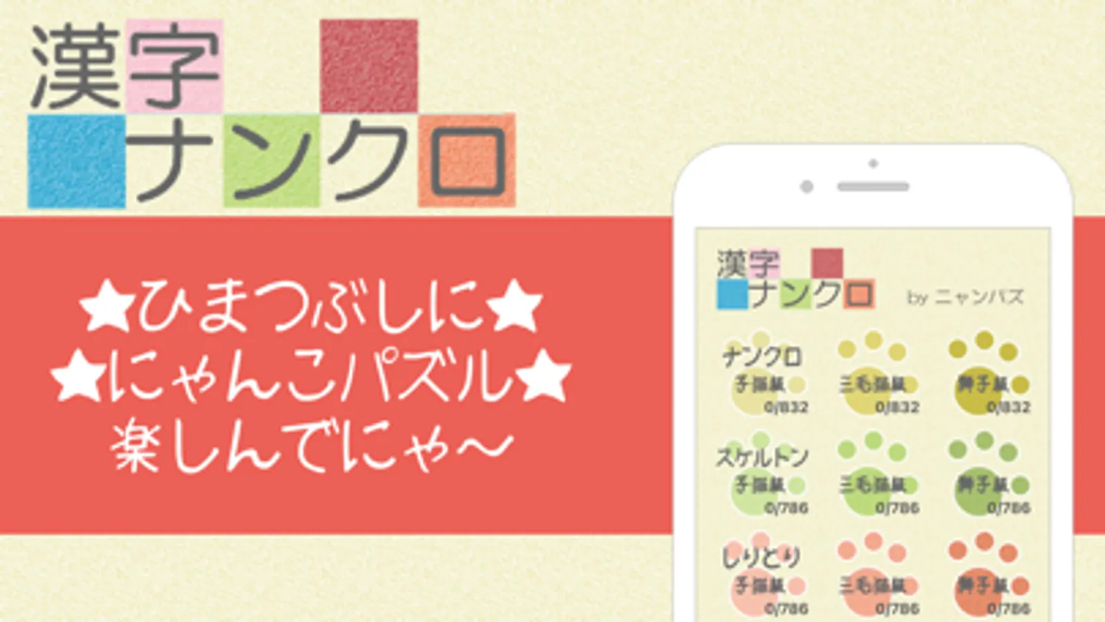 難易度は各パズル3段階(子猫級・三毛猫級・獅子級)。やりごたえも十分の漢字アプリ!