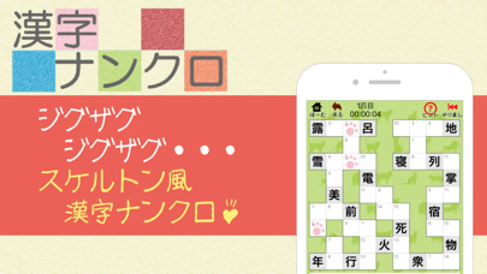 ビッグサイズの漢字パズルは、やりごたえ十分!漢字ナンクロ・スケルトン・しりとりの3種類が、大きな盤面で楽しめます。画面いっぱいの盤面を漢字で埋め尽くして、爽快感を味わってね!