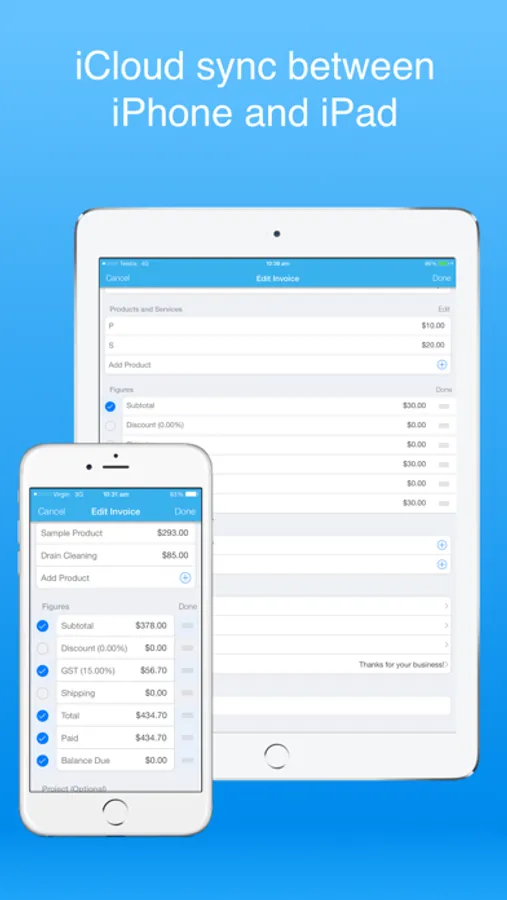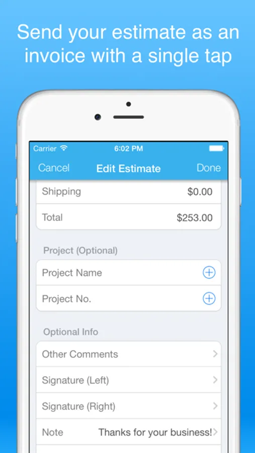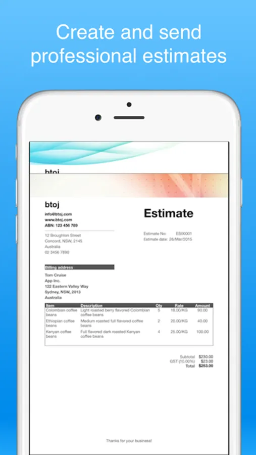 • Delete items (e.g. Estimates, products, customers) by swiping to left