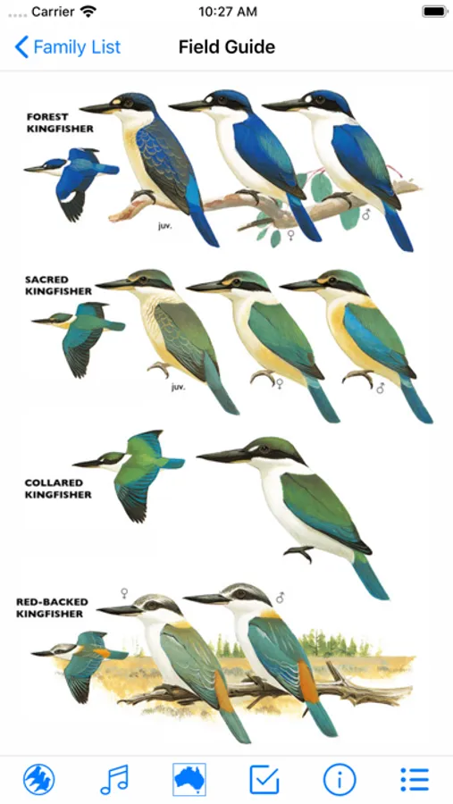 The FIELD GUIDE displays the full field guide (family) pages of the book. You can browse the pages, select from the family list, or search for a specific species in the bird list. Selecting a bird links to the full functions toolbar.