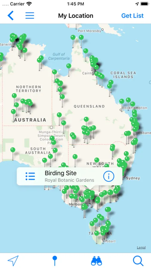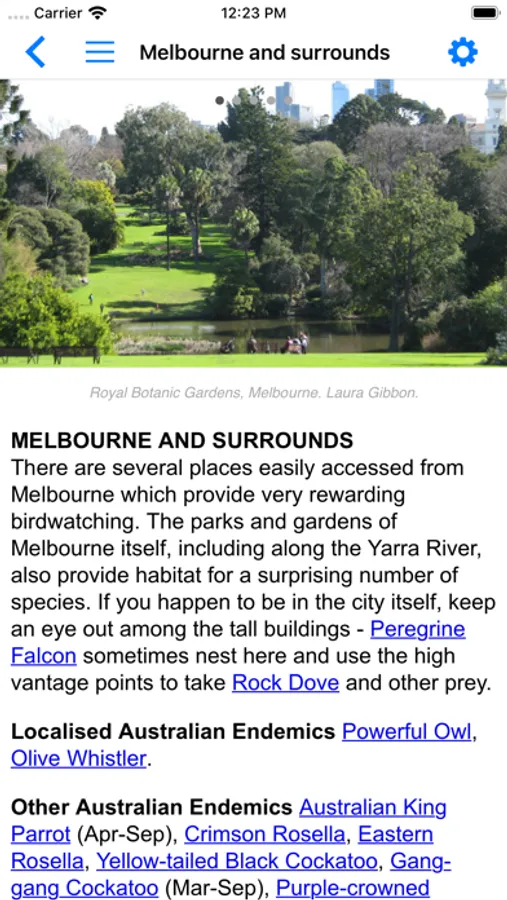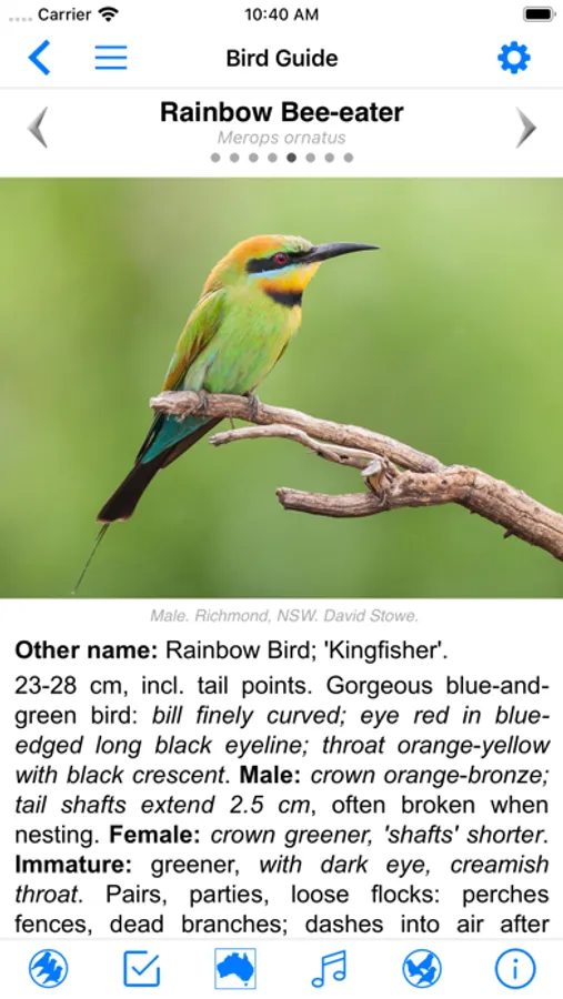 BIRDING SITES includes descriptions and photos of over 270 birding sites from around Australia, with functions for a bird list and ‘show on map’.