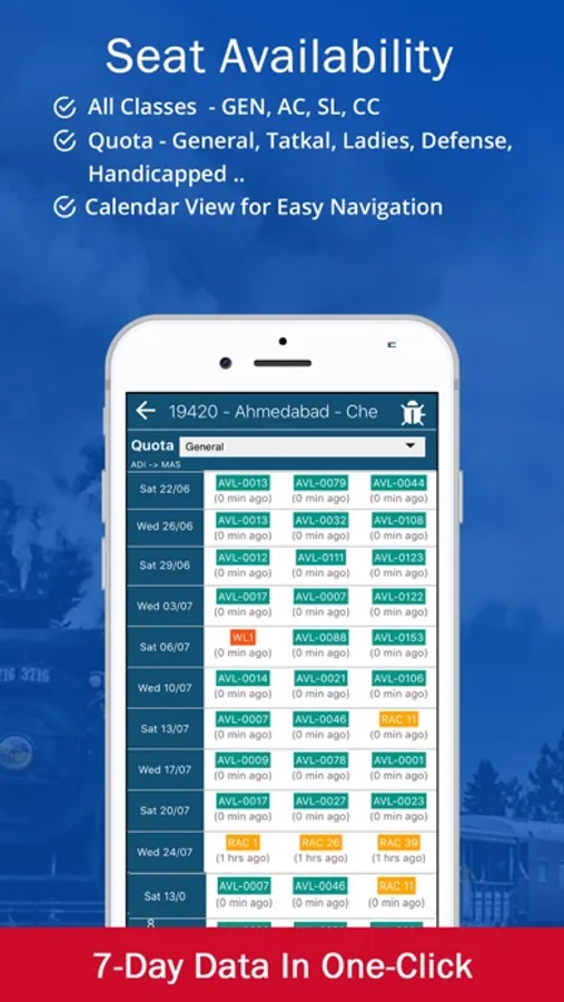 Hotfoot app lets you check train seat availability for any class in an easy-to-use calendar layout. Just tap on the calendar to see the availability of train seats. It includes train seat availability for all popular trains 07005, 14206, 12150, 12565, 12225, 12402, 19038, 12703, 11060, 12149, 15097, 12367, 15232, 12398, 13049, 12915, 19041, 12321, 12860, 12204, 11062, 19042, 12533, 11079, 12393 and other 7000 trains.
