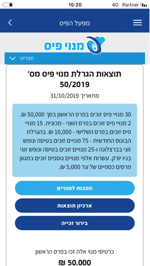 מפעל הפיס מגיע אליכם ישירות לטלפון החכם ביישומון ייחודי שיספק לכם את כל תוצאות ההגרלות הפיס השונות, לרבות: לוטו, צ'אנס, פיס 777, 123, מנוי פיס וכל כרטיסי החיש-גד הזמינים לרכישה בנקודות המכירה.