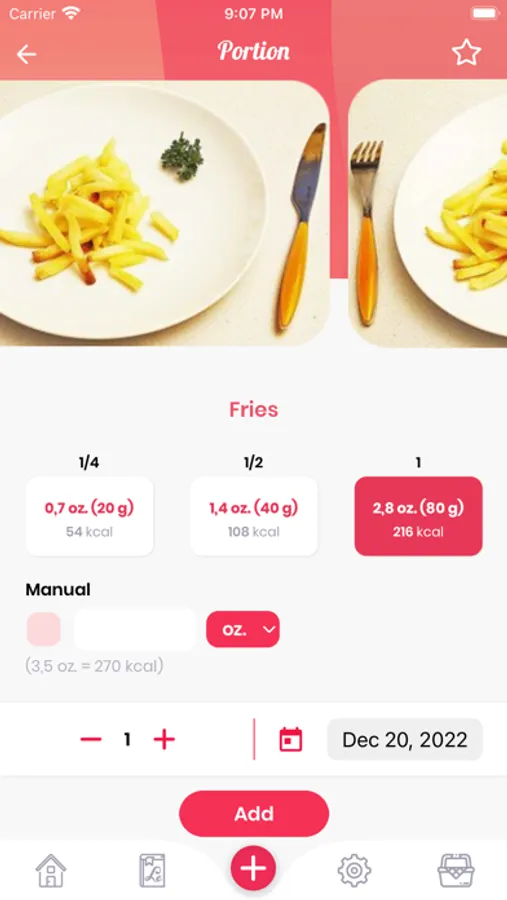 - Each time you eat something, look it up in the photo database and add that item to your cart for the day. A bar gauge on the side of the Dashboard shows how many Calories you have left for that day.