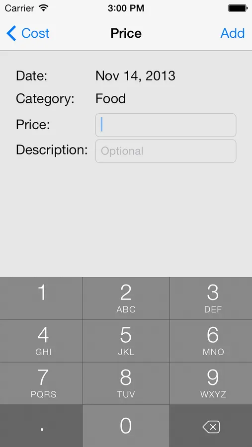 No need to import details of your bank account, your income or cash. Simply just choose Date and Category, enter the price and a description if you like to.