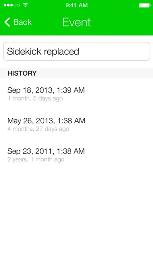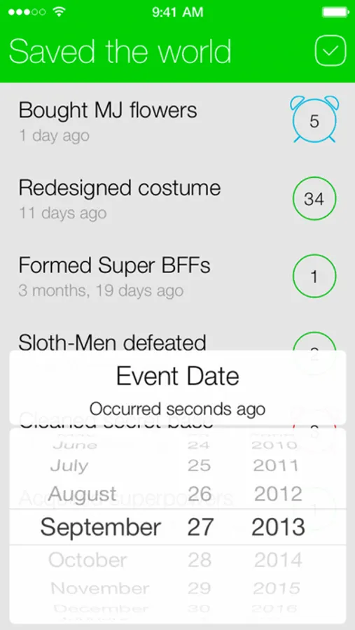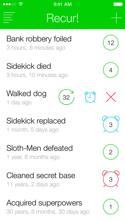 When you do something that you want to remember – like saving the planet from a race of evil sloths – just add a new event in Recur. You can check back at any time to see how long it’s been since that fateful day. If the Sloth-Men are foolish enough to attack (ever-so-slowly) again, you can refresh the event to update its counter and timestamp.