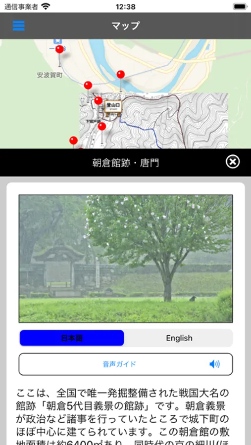当アプリでは、あなたの現在地を取得し、現代地図や古絵図を見ながら一乗谷を探索できます。主要ポイントでは詳細情報を表示したり、音声によるガイダンスを聞くことができます。一乗谷を歩きながら、戦国時代を生きた武将や、市井の人達の生活に思いを馳せ、歴史に浸ってみませんか?