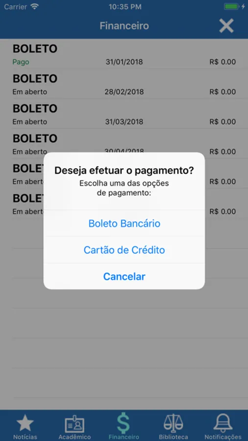 - Consulta de Extrato Financeiro (pagamento através de boleto ou cartão de crédito);