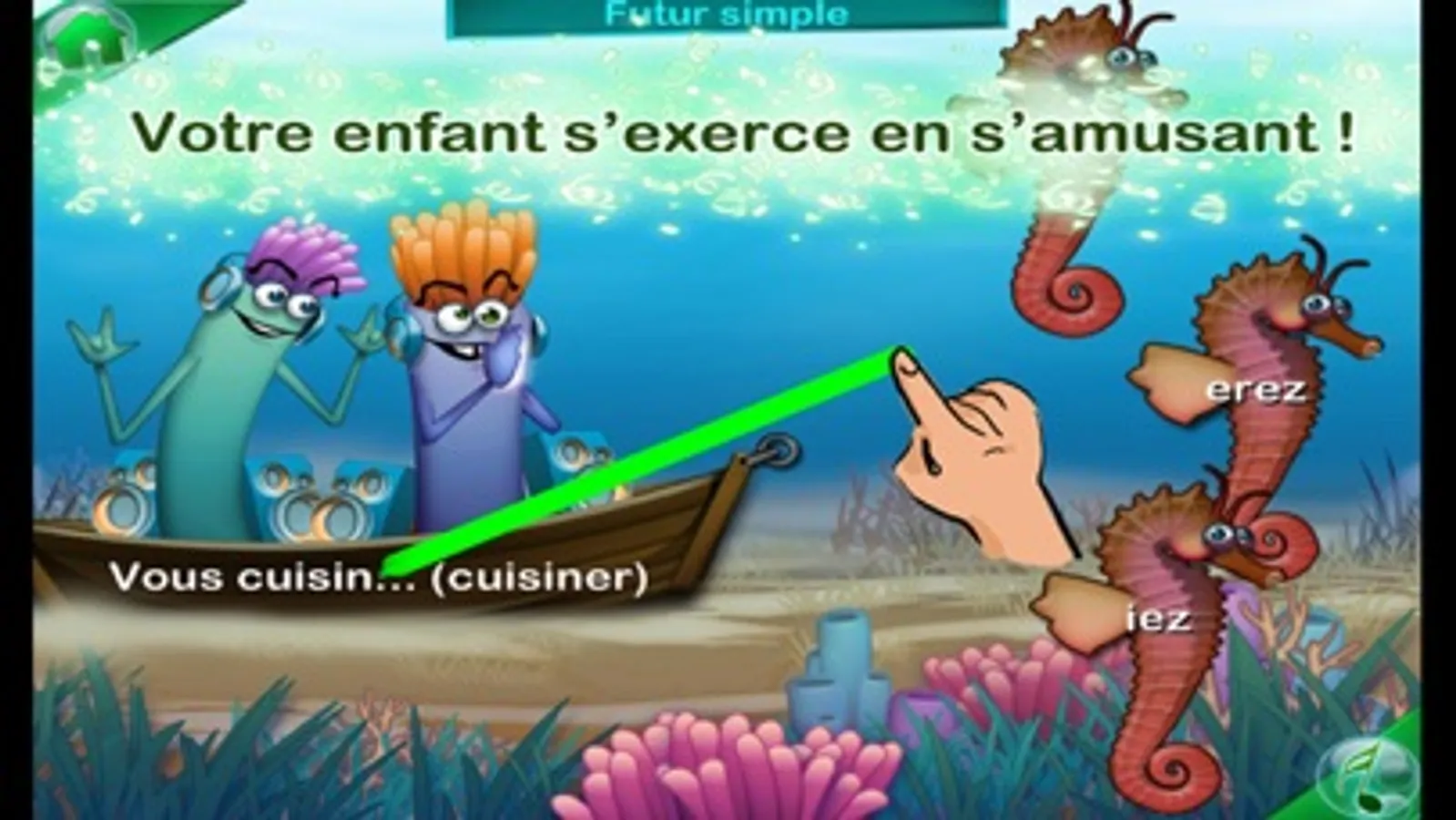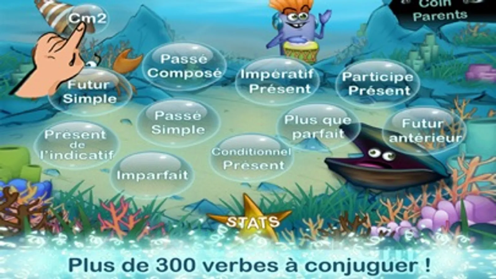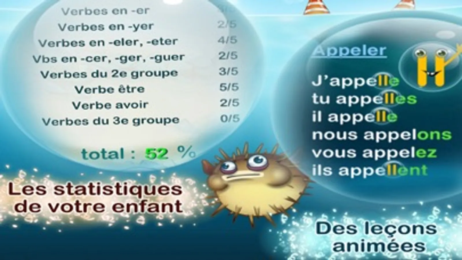 « Révise ta conjugaison » est un jeu complet pour réviser et s’entraîner sur la conjugaison de plus de 300 verbes suivant les programmes des classes de CE1, CE2, CM1 et CM2. Plongé dans un univers sous-marin drôle et stimulant, votre enfant va jouer à :