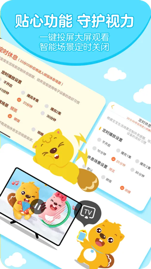 视频播放界面大屏大按钮,简单易用,1岁宝宝即可轻松自主选择内容,给予家长更多自我空间。内容分龄且支持场景推荐,包括叫早、哄睡、运动等多模式需求。支持手机、Pad、智能电视等多种终端设备,随时随地方便使用。