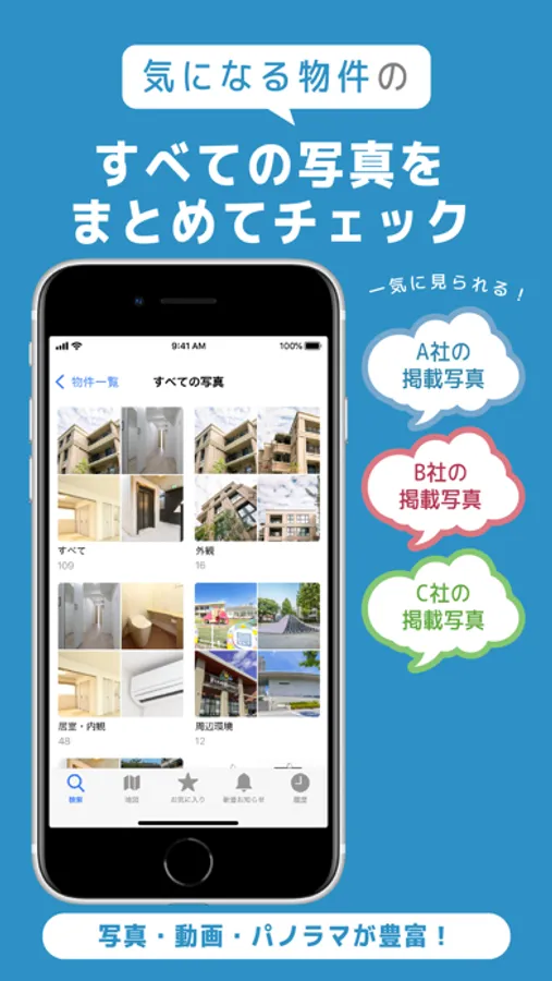 ニフティ不動産の賃貸物件検索アプリは、SUUMO(スーモ)やLIFULL HOME'S(ライフルホームズ)、athome(アットホーム)など14の有名な不動産サイト(※1)の賃貸物件情報をまとめて掲載しています。
