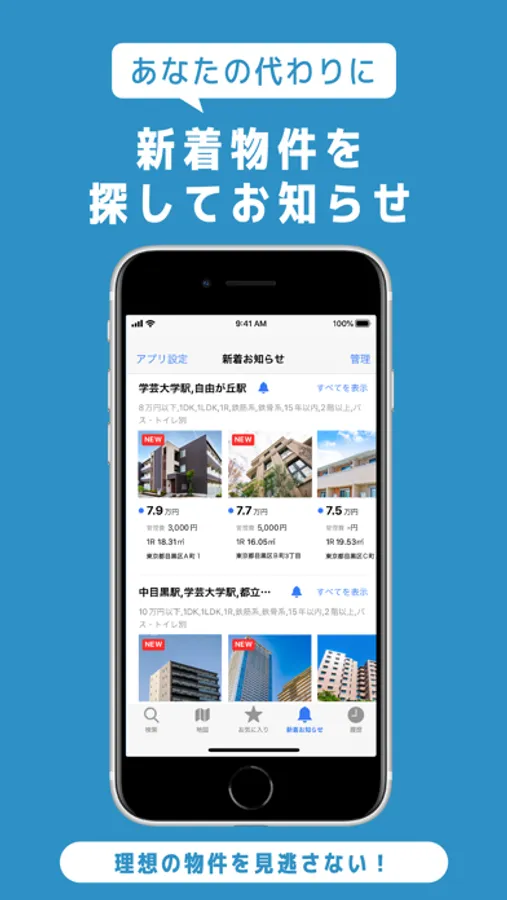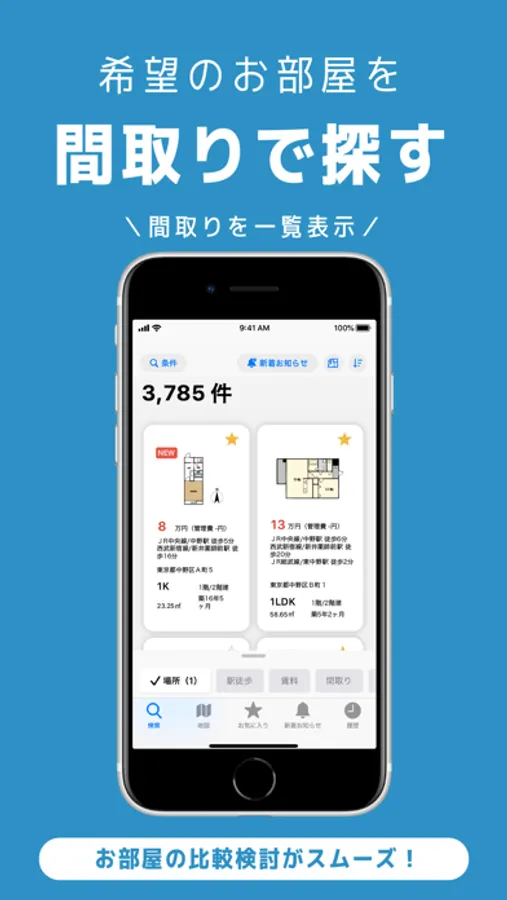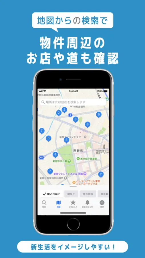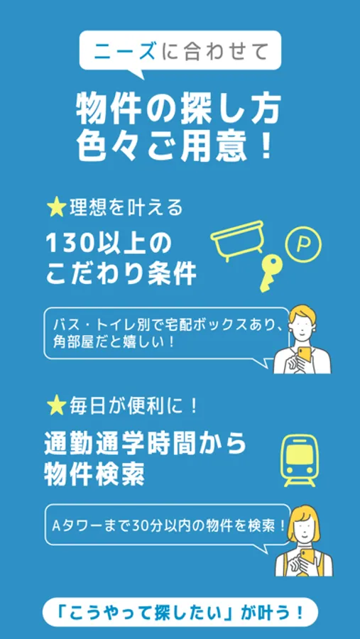 「勤務先や学校から30分以内の物件だけ見たい」「今の家の周辺で探したい」「ペット可の物件だけ探している」などのこだわり条件や、「地図で周辺のコンビニなどの施設を確認しながら探す」など多様なニーズに応える検索方法で理想の物件を探すことができます。