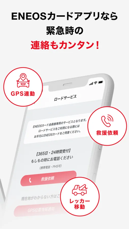 もしもの時もアプリがあればGPS機能でお客さまの現在位置をフォローし、緊急の連絡も簡単!万が一の際のクルマのトラブル時でも安心!