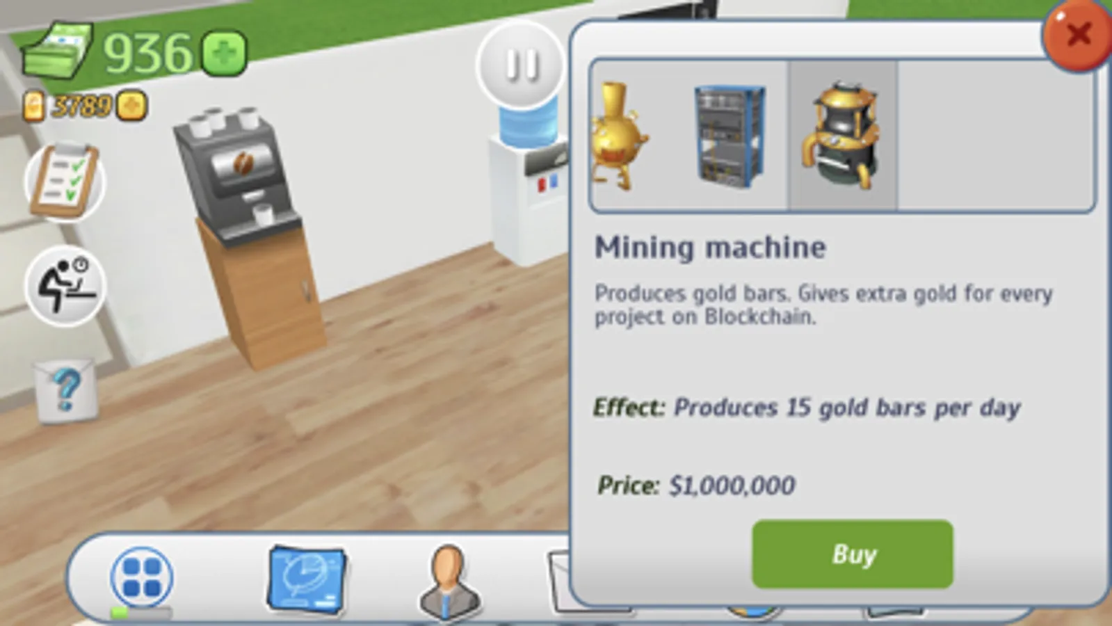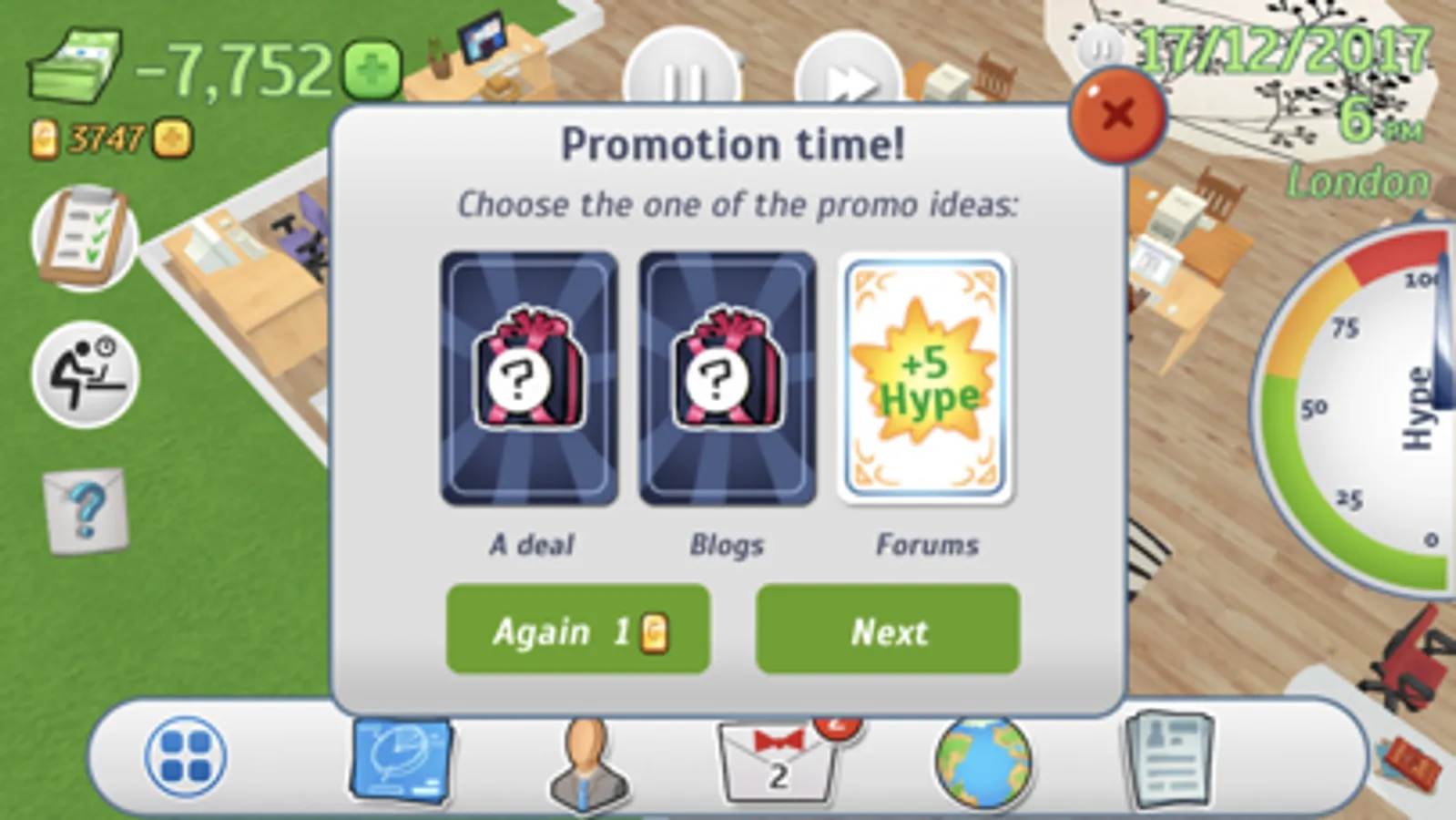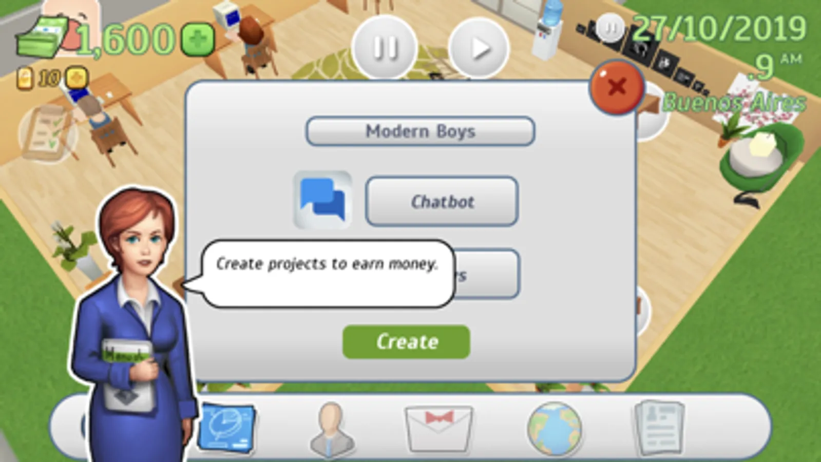 Try to turn a small garage start-up into a large company. Take strategic decisions, buy tables and table plants, hire and train people. Fulfill their wishes! Create mobile apps and games!