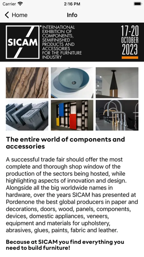 Plan your visit to the fair, using the new app that SICAM has created for its visitors from around the world: you will find everything you need to optimize your time. From the floor plans of each pavilion at the details of each exhibitor, with all the references which may be useful, and breakdowns by product category, which allow you not to miss anything of what you want to find.