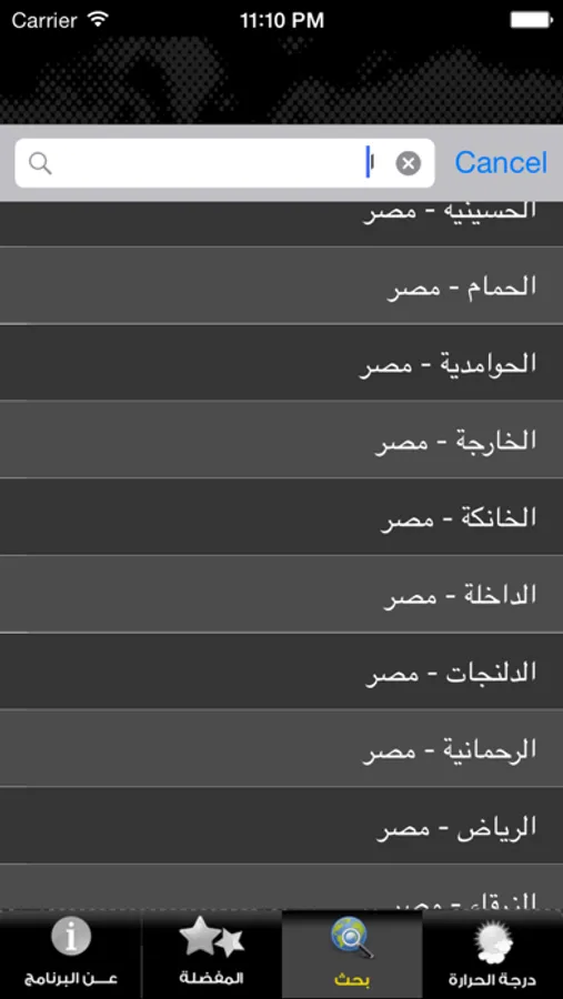 ٢. صفحة البحث و تمكنك من البحث عن المدن المتاحة , و عند اختيارك لمدينة يتم إضافتها للمفضلة و يتم عرض حالة الطقس لها.