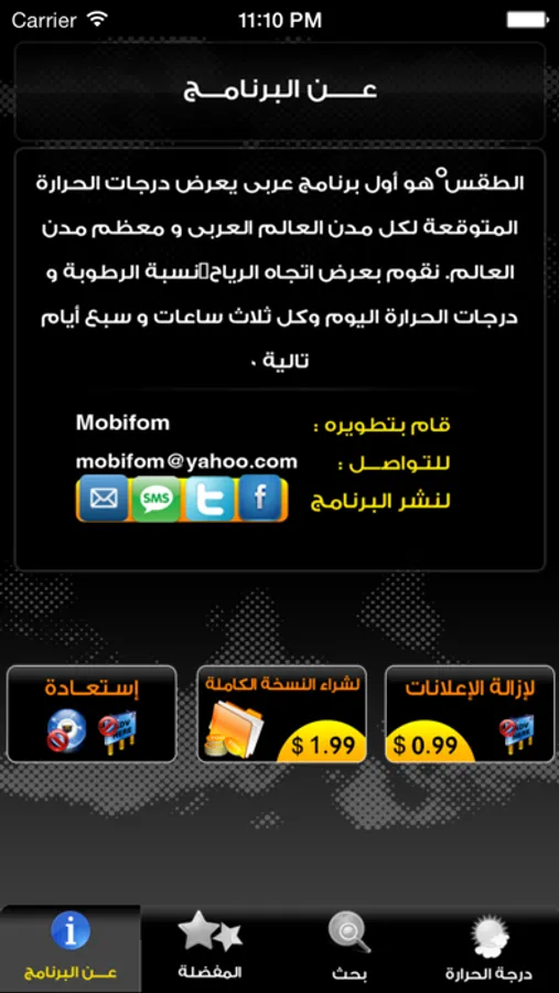٤. عن البرنامج و تحتوي علي بعض الوسائل المساعدة في نشر البرنامج مثل الفيس بوك - تويتر - الرسائل النصية القصيرة - البريد الالكتروني كما تحتوي علي بعض الخصائص الاضافية والتي يمكن شراؤها وهي:-