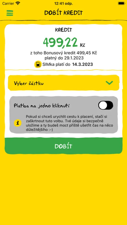Kredit si tu snadno dobiješ, tak ti neunikne žádná naše facebooková akce, při které přidáváme kredit navíc za dobití. Pokud nechceš při každém dobíjení hledat platební kartu, stačí když si aktivuješ platbu na jedno kliknutí a příště jen vybereš částku, klikneš na dobít a je hotovo :)