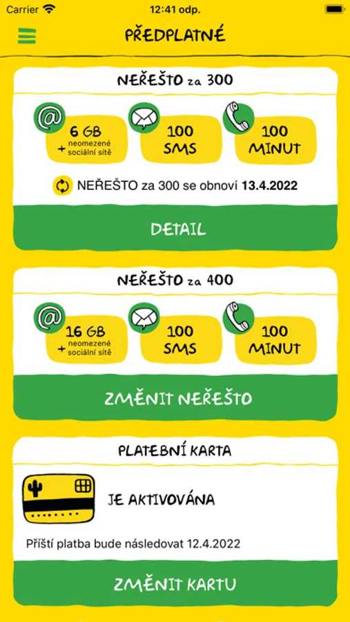 V aplikace si snadno vybereš jeden ze super předplacených tarifů NEŘEŠTO, nikam nemusíš chodit, nic podepisovat, jen připojíš svou PLATEBNÍ KARTU a tarif se sám zaplatí po 30 dnech.